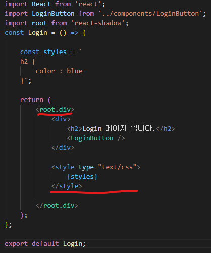 설치 npm i react-shadow 리액트에서 css 를 컴포넌트 독립적으로 사용할수있는 라이브러리이다 vue에서 컴포넌트 안에 css scope 주고 사용하는거랑 비슷한느낌이다 html 단에 react-shadow 의 root.div 를 이용해서 다른 컴포넌트에는 영향을 받지않는 독립적인 컴포넌트로 감싼후 그 안에 style 태그로 상위 스크립트 단에서 정의한 스크립트를 넣어주면 된다. ex : 저 파일이 아닌 index.css(전역css) 에서 h2 에 스타일을 정의해도 안먹음